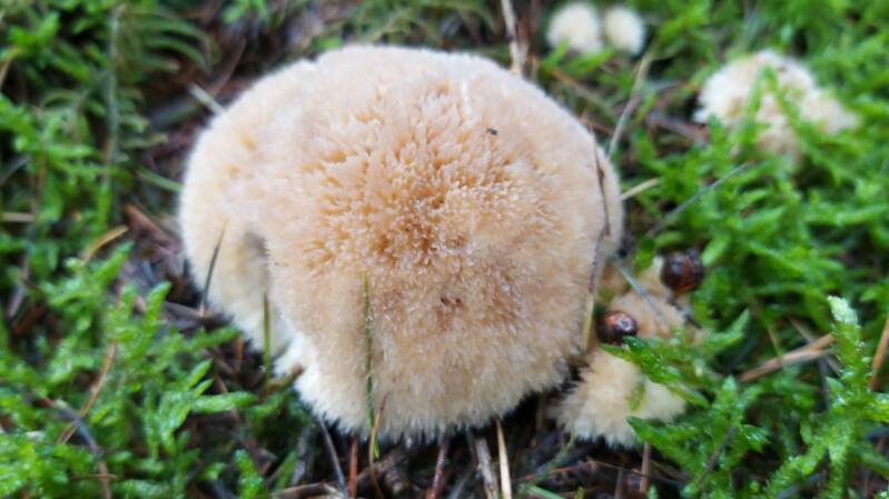Kussenvormig wit tot lichtbruin, zacht borstelig behaard vruchtlichaam.
